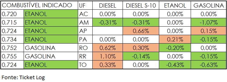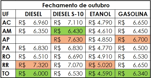 A última análise do Índice de Preços Edenred Ticket Log (IPTL), levantamento que consolida o comportamento de preços das transações nos postos de combustível, trazendo uma média precisa, apontou que, no fechamento de outubro, o preço médio do litro da gasolina na Região Norte recuou 0,31%, ante a primeira quinzena do mês, e foi comercializado a R$ 6,47. O etanol na Região permaneceu estável, e foi encontrado a R$ 4,70. Já o litro do diesel comum apresentou acréscimo de 0,15% em relação à primeira quinzena e foi encontrado a R$ 6,69, enquanto o tipo S-10 não apresentou alteração e fechou o período a R$ 6,71.