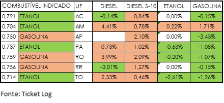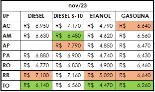 De acordo com a última análise do Índice de Preços Edenred Ticket Log (IPTL), levantamento que consolida o comportamento de preços das transações nos postos de combustível, trazendo uma média precisa, na primeira quinzena de novembro o preço médio do litro da gasolina foi comercializado R$ 6,42 na Região Norte, com redução de 0,77% ante outubro. O preço do etanol reduziu 0,64% e fechou a quinzena a R$ 4,67. Já o diesel ficou mais caro ante o mês anterior e o comum fechou a R$ 6,79, após recuo de 1,49% e o S-10 foi comercializado a R$ 6,79, com redução de 1,19%.