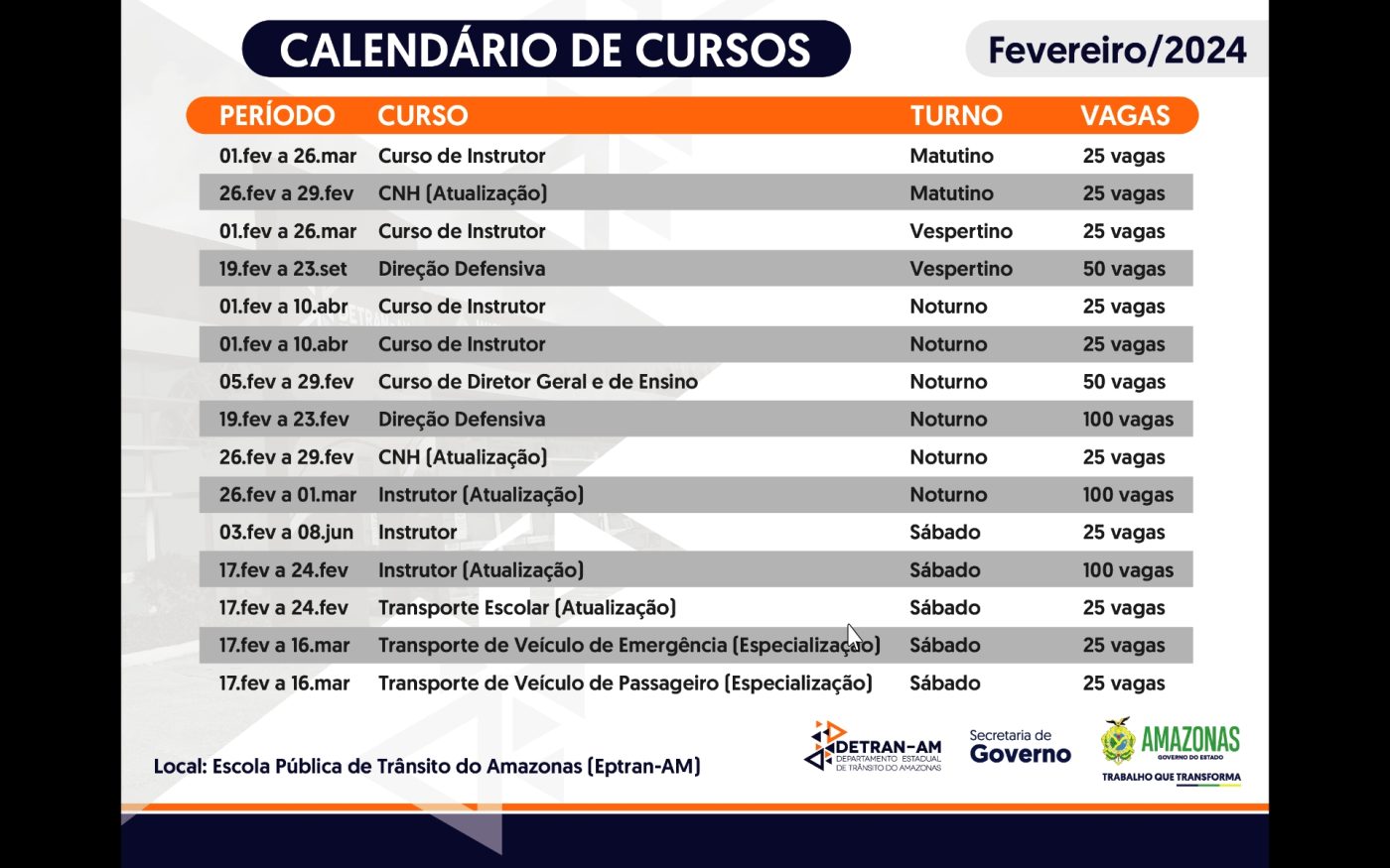 O Departamento Estadual de Trânsito do Amazonas (Detran-AM) informa que estão abertas as inscrições para os cursos de Instrutor de Autoescola, de Diretor Geral e de Ensino de Autoescola, Atualização de CNH, Instrutor de Transporte Escolar, além de Direção Defensiva, Condutor Especializado de Veículo de Emergência e Condutor Especializado em Transporte de Coletivo de Passageiros. Todos irão iniciar em fevereiro, e ocorrerão na sede da Escola Pública de Trânsito (Eptran).