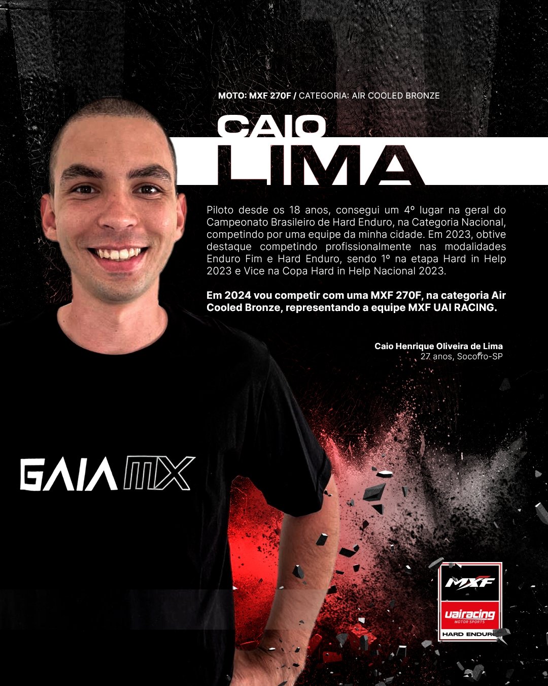 Fecha o time, Caio Henrique Oliveira de Lima, de 26 anos. Paulista, natural de Santo André e atualmente morador de Socorro, o piloto percorre as mais duras trilhas desde os 18, conquistando diversos títulos. “Gosto de destacar a conquista de 2022, onde competi profissionalmente por uma empresa da cidade na modalidade Enduro Fim e Hard Enduro e fiquei com o 4° Lugar na geral do Campeonato Brasileiro de Hard Enduro Categoria Nacional”, comenta. “Chegamos com um time de pilotos jovens, mas experientes no off-road. Acreditamos muito no potencial deles e estamos confiantes que ao final de cada etapa, teremos belos resultados”, afirma Maycon Garcia, chefe de equipe MXF UAI Racing.