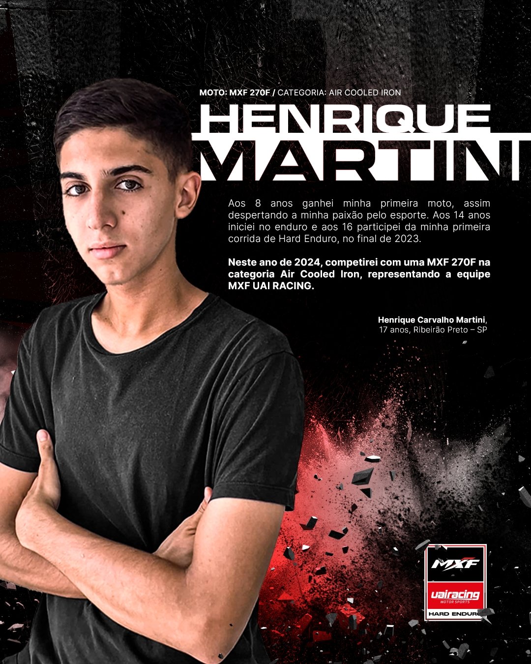 Durante o evento, a MXF, montadora de veículos off-road com sede no Paraná, juntamente com a revenda parceira UAI Racing de Belo Horizonte, apresenta sua nova equipe, que contará com quatro pilotos, incluindo Henrique Carvalho Martini, um jovem de 17 anos de Ribeirão Preto, São Paulo. Apaixonado pelo esporte desde a infância, Henrique enfrentou sua primeira corrida de Hard Enduro aos 16 anos no final do ano passado. Em 2024, ele encara o desafio pela segunda vez, competindo com uma MXF 270F na categoria Air Cooled Iron.
