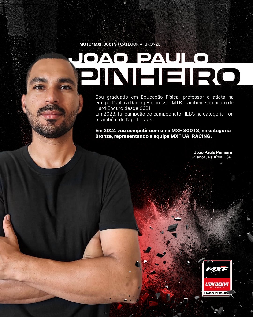 Aos 34 anos, João Paulo Pinheiro é o mais experiente da nova equipe da montadora paranaense. Paulista, natural de Paulínia, é piloto de Hard Enduro desde 2021, conquistando destaque no esporte. No ano passado, foi campeão do campeonato Hard Enduro Brasil Series (HEBS) na categoria Iron e, neste ano, mantém o foco em alcançar resultados igualmente positivos. Graduado em Educação Física, é professor e atleta na equipe Paulínia Racing Bicicross e MTB. “Estou animado, confiante e disposto a enfrentar os novos desafios da edição 2024 do campeonato”, afirma.