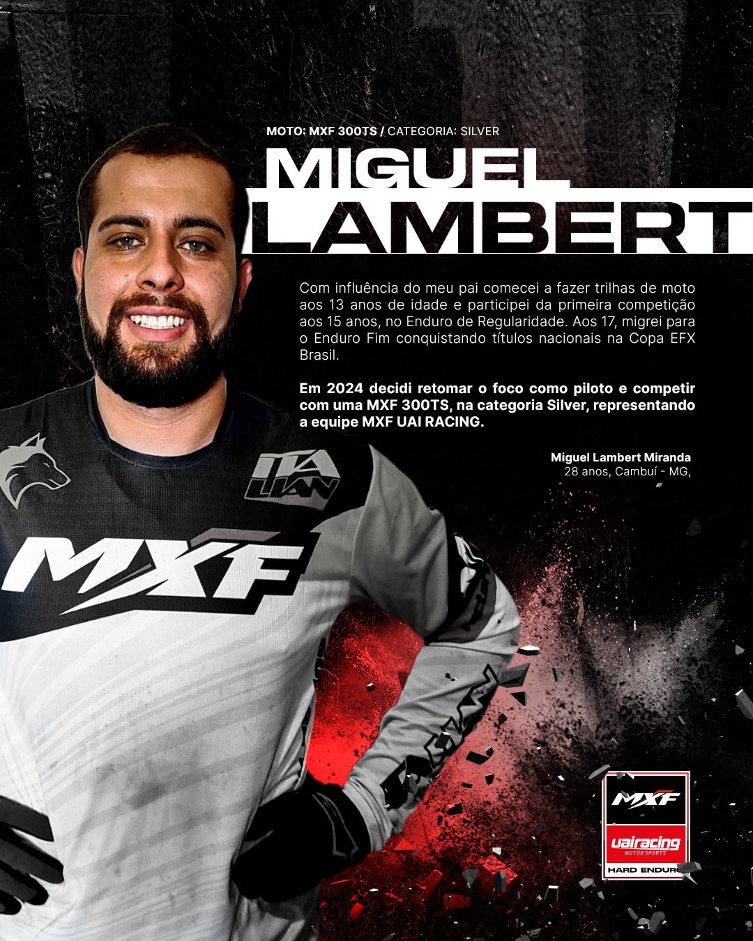 O mineiro Miguel Lambert Miranda, de 23 anos, também integra a equipe MXF. Miguel foi influenciado pelo pai, outro fã do motociclismo. “Comecei a fazer trilhas com 13 anos, e, aos 15, participei das primeiras competições como o Enduro de Regularidade. Aos 17 anos, para o Enduro Fim, conquistei títulos no cenário nacional dentro da extinta Copa EFX Brasil”, conta. Após alguns anos afastado das competições, o piloto retorna ao cenário do Hard Enduro, assumindo os papéis de atleta e organizador. Para este ano, o objetivo principal é alcançar a linha de chegada.