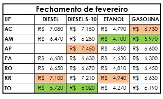 Dados do Índice de Preços Edenred Ticket Log (IPTL), levantamento que consolida o comportamento de preços das transações nos postos de combustível, trazendo uma média precisa, apontaram que na Região Norte o preço médio do litro do etanol foi comercializado a R$ 4,45 no fechamento de fevereiro e a gasolina a R$ 6,27, ambos com o preço estável, ante a primeira quinzena do mês. O preço do litro do diesel comum e o do S-10 registrou baixa de 0,15%, fechando o mês a R$ 6,61 e R$ 6,50, respectivamente.
