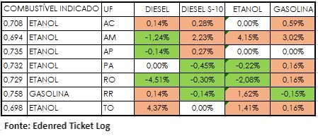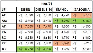 Dados do Índice de Preços Edenred Ticket Log (IPTL), levantamento que consolida o comportamento de preços das transações nos postos de combustível, trazendo uma média precisa, apontaram que na Região Norte o preço médio do litro do etanol foi comercializado a R$ 4,48 na primeira quinzena de março, após ficar 0,67% mais caro, ante fevereiro. Já a gasolina foi comercializada a R$ 6,31, com aumento de 0,64%. O preço do litro do diesel comum e do S-10 se manteve estável, quando comparado ao fechamento de fevereiro e as médias fecharam a quinzena a R$ 6,61 e R$ 6,50 respectivamente.