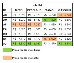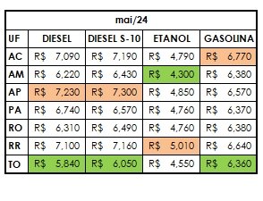 Dados do Índice de Preços Edenred Ticket Log (IPTL), levantamento que consolida o comportamento de preços das transações nos postos de combustível, trazendo uma média precisa, apontaram que na Região Norte o preço médio do litro da gasolina foi comercializado a R$ 6,39 no fechamento da primeira quinzena de maio, maior média do país, após aumento de 0,31%, ante abril. Já o etanol foi encontrado a R$ 4,62, com aumento de 1,32%. O diesel comum obteve alta de 0,91%, custando R$ 6,64. Já o diesel S-10 foi encontrado a R$ 6,46, após registrar baixa de 0,15% no preço.