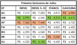 A mais recente análise do Índice de Preços Edenred Ticket Log (IPTL), levantamento que consolida o comportamento de preços das transações nos postos de combustível, trazendo uma média precisa, apontou que, na primeira quinzena de julho, a região Norte registrou a gasolina mais cara do País. O preço médio do litro do combustível encerrou o período a R$6,48, o que representa um aumento de 1,25% ante o fechamento de junho. Os outros tipos de combustível também tiveram aumento no preço. O diesel comum foi comercializado, em média, a R$6,71 (+ 1,5%), o diesel S-10 a R$6,51 (+ 1%) e o etanol a R$4,65 (+ 0,8%).