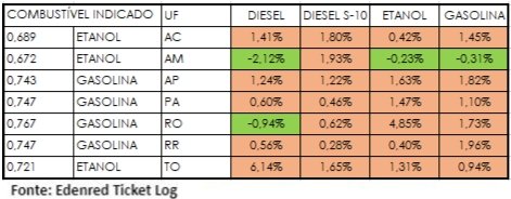 “Foi nos postos de combustível do Amazonas onde se viu a maior redução no preço do litro do diesel comum e da gasolina. Já no Amapá, o motorista encontrou o diesel S-10 mais caro de todo o País, e no Acre foi registrada a gasolina mais cara de todo o território nacional. Rondônia foi o estado brasileiro que teve o maior aumento do preço médio do etanol, que cresceu 4,85%. Abastecer com etanol foi considerado mais econômico em apenas três estados nortistas, ainda assim aponto o combustível como ecologicamente mais interessante por emitir menos poluentes na atmosfera e contribuir para uma mobilidade de baixo carbono”, destaca Douglas Pina, Diretor-Geral de Mobilidade da Edenred Brasil.