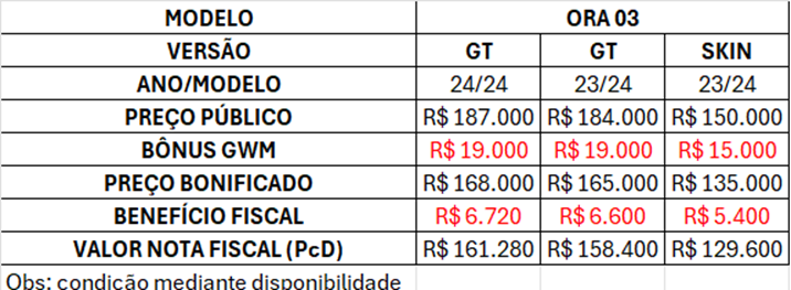 Já na versão GT na linha 2023/2024, o preço de tabela cai de R$ 184.000 para R$ 158.400, devido ao bônus GWM de R$ 19.000 mais R$ 6.600 de benefício fiscal. O ORA 03 GT linha 2024/2024 reduz seu preço de R$ 187.000 para R$ 161.280 na opção PCD, com bônus GWM de R$ 19.000 e R$ 6.720 de benefício fiscal. A única versão que não está habilitada para o programa é a série especial ORA 03 GT Approve.