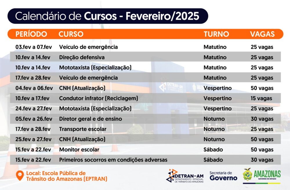 O Departamento Estadual de Trânsito do Amazonas (Detran-AM), por meio da Escola Pública de Trânsito (Eptran), está com inscrições abertas e gratuitas para cursos que serão oferecidos durante o mês de fevereiro. No total, estão sendo disponibilizadas 309 vagas nos turnos de manhã, tarde e noite. Os cursos disponíveis são: Direção Defensiva, Veículo de Emergência, Atualização de CNH, Reciclagem de Condutor Infrator, Mototaxista (Especialização), Diretor Geral e Ensino, Transporte Escolar, Monitor Escolar e Primeiros Socorros em Condições Adversas.