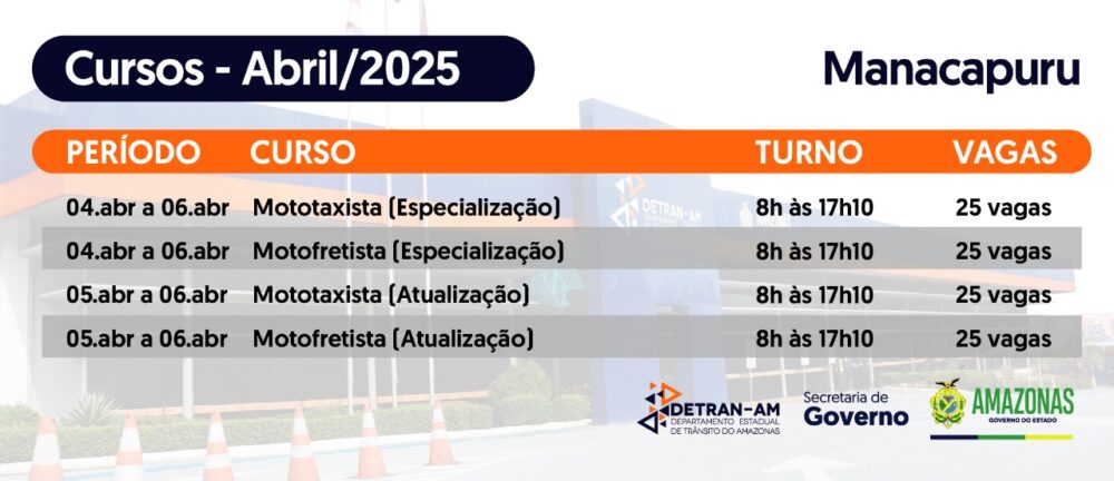 O Departamento Estadual de Trânsito do Amazonas (Detran-AM), por meio da Escola Pública de Trânsito (Eptran), está com inscrições abertas para 100 vagas em cursos gratuitos de Especialização e Atualização destinados a mototaxistas e motofretistas de Manacapuru (a 68 km de Manaus). As capacitações ocorrerão entre 4 e 6 de abril, com turmas divididas em especialização (25 vagas por categoria, de 4 a 6/04) e atualização (25 vagas por categoria, dias 5 e 6/04), das 8h às 17h10. Para participar, é necessário ter habilitação na categoria “A” há pelo menos dois anos e apresentar CNH original, cópia e comprovante de residência no Posto de Atendimento Descentralizado (PAD) do Detran-AM no município. A iniciativa visa aprimorar a qualificação profissional e a segurança no trânsito, reduzindo riscos de acidentes na região.
