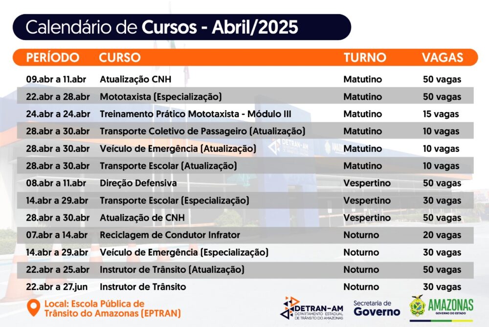 O Departamento Estadual de Trânsito do Amazonas (Detran-AM), por meio da Escola Pública de Trânsito (Eptran), está com inscrições abertas para 405 vagas em cursos gratuitos durante o mês de abril. As capacitações abrangem desde formação profissional, como instrutor de trânsito, até atualização de condutores e reciclagem para infratores, com opções nos turnos matutino, vespertino, noturno e aos sábados.