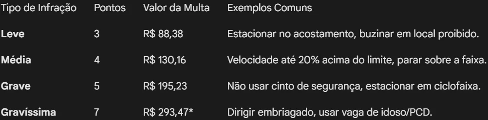 Nota: No caso de embriaguez ao volante, a multa possui fator multiplicador e pode chegar a quase R$ 3.000,00, além de gerar suspensão imediata.