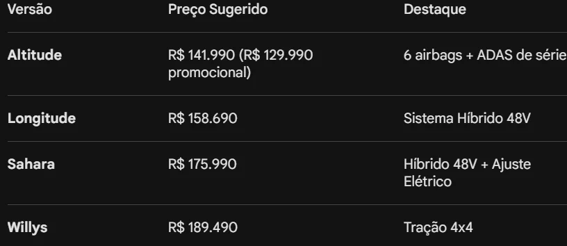 Em um movimento raro no mercado, a Jeep reduziu os preços das versões de volume. As opções Altitude e Longitude estão, respectivamente, R$ 6 mil e R$ 7 mil mais baratas do que os modelos anteriores.