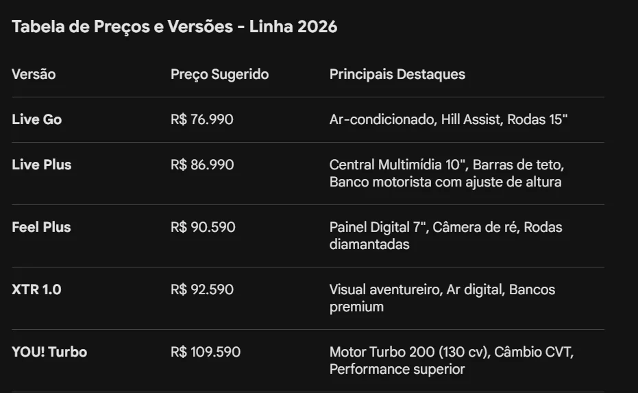 C3 Live Go (R$ 76.990): A nova porta de entrada chega com um desconto de R$ 9.600 no mês de lançamento. É, atualmente, o hatch mais acessível do país com esse porte.