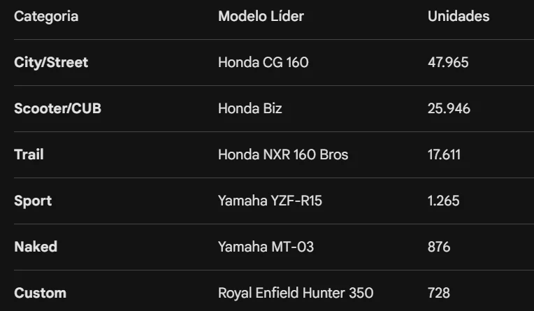 A hegemonia da Honda CG 160 permanece inabalável, sendo o veículo mais vendido do país em qualquer categoria. No entanto, nichos como o de Naked/Roadster e Custom mostram uma disputa cada vez mais acirrada com a ascensão de marcas como Bajaj e Royal Enfield.