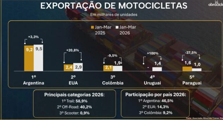 A Argentina continua sendo o destino número um das motos “Made in Brazil”. O país vizinho detém uma fatia de 46,5% do total exportado, somando 9,5 mil unidades no acumulado do trimestre — um crescimento de 3,3% em relação ao ano anterior.